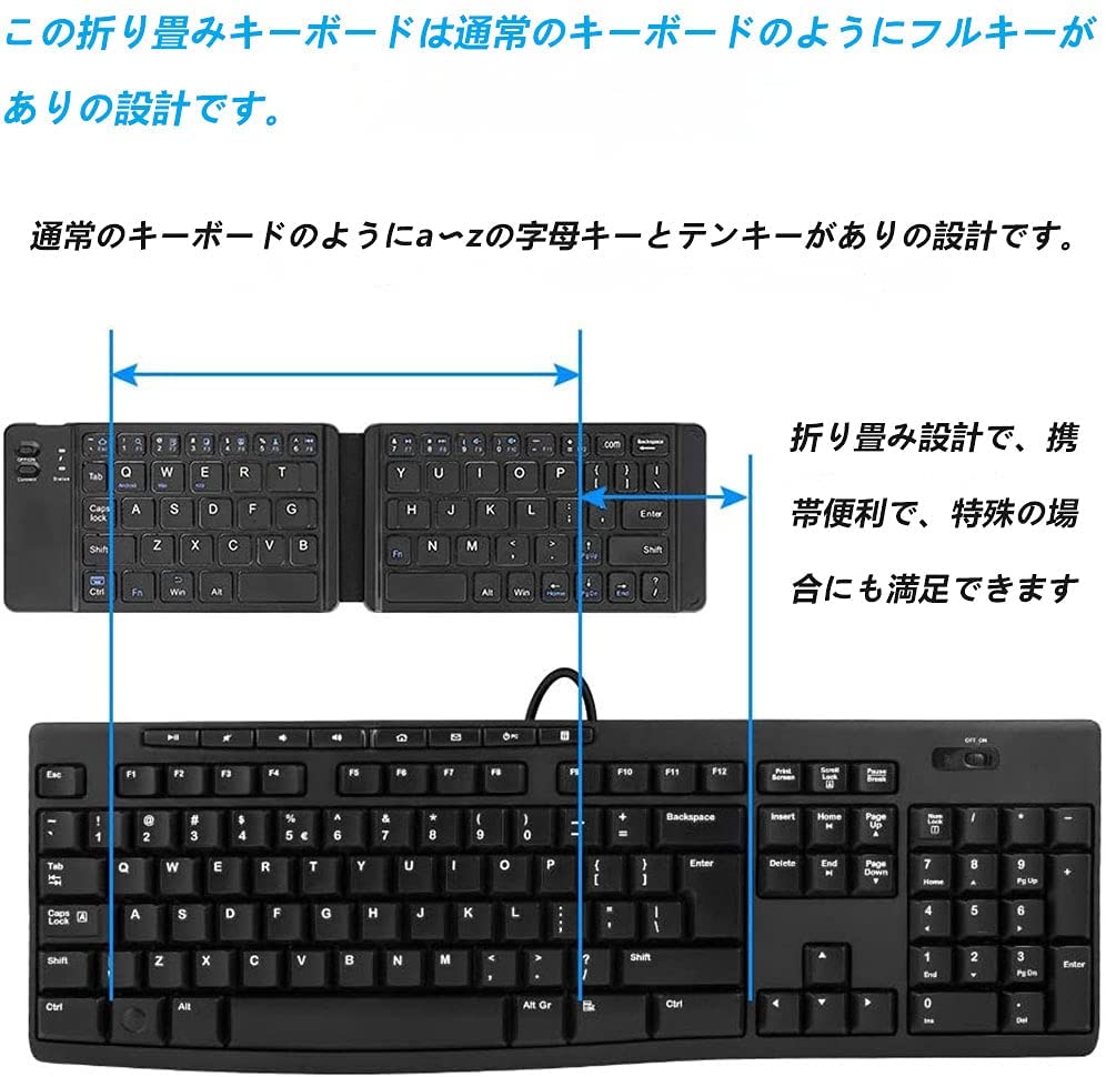 - 【折り畳みBluetoothキーボード】無線Bluetoothキーボード接続で、快適・ストレスフリーな文字入力、通常標準的なキーボードのように感じます、普段に使えられたpcキーボードと比べても、見劣りをしないタイピング感を実現しました。両側から折り畳めて収納できるデザインで、出掛け先でもご自宅でも職場でも使用場所を選びません。